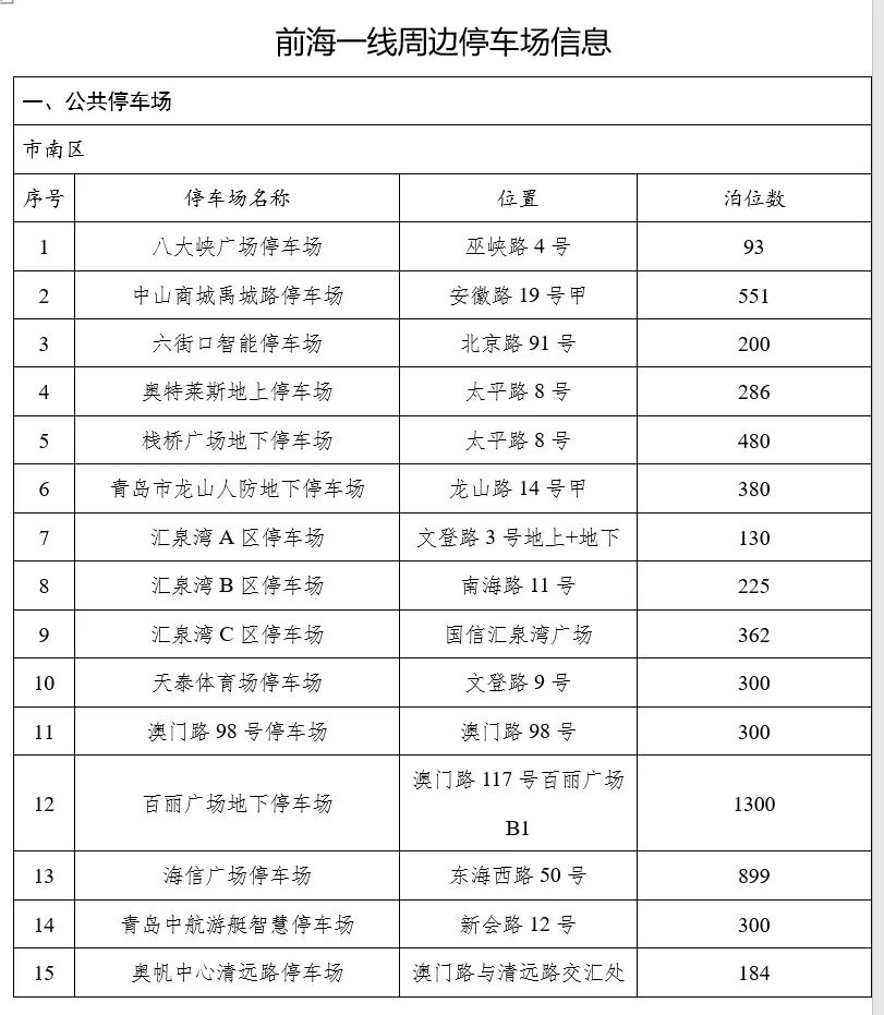 春节期间拜年访友、亲朋聚餐、休闲旅游等需求上升。预计从大年初二开始,旅游景区、商业街区、节庆会场等周边道路交通流量将会大幅上升,为了方便广大市民朋友出行及停车,维护良好的道路交通秩序,青岛交警发布前海一线及周边区域停车交通指引。前海一线公共停车场,市南区20处,市北区14处;前海一线大客车停车场,市南区13处,市北区1处。
