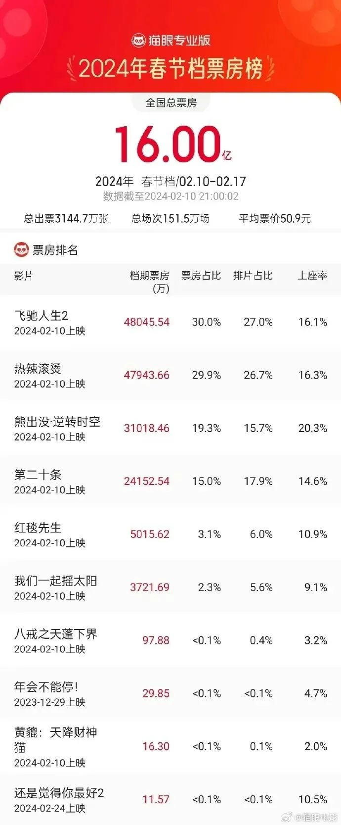 据猫眼专业版数据,截至2024年2月10日21时,2024年春节档总票房突破16亿元。目前,《飞驰人生2》《热辣滚烫》《熊出没·逆转时空》分列春节档新片票房榜前三。