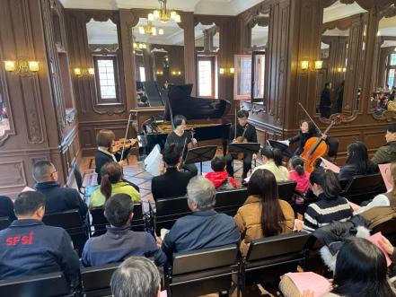 这场汇聚了上音优秀师生的新春音乐会,融合了钢琴、古筝、琵琶独奏,男女声独唱和弦乐四重奏等形制,作品汇聚古今中外优秀经典作品,如《牧童短笛》《绒花》《送我一枝玫瑰花》《闹元宵》等,也有《快给大忙人让路》《蓝色多瑙河》《爱的致意》,“沙龙”形式的音乐会让演员与观众之间距离更近,让镜厅内散发着音乐的芬芳。