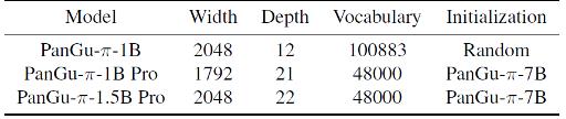 PanGu-π-1B 和 PanGu-π-1.5B 的结构设定