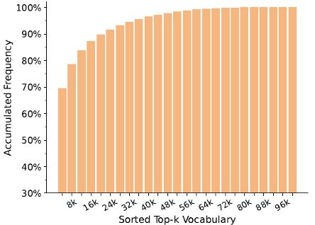 实际上,词表中存在大量冗余。通过使用从 PanGu-$\pi$ 模型继承的 100k 词汇表初始化分词器,我们对包含大约 1.6T 分词的庞大语料库进行了频率分析。如下图所示,词表表现出长尾效应,其中前 48k 词汇就占据训练语料库的 97.86%,也就是说超过 50% 的词汇可能是多余的,因为它们只满足不到 3% 的语料库。把低频词表删除,就可以大幅降低词表参数量,把空间留给模型主体,用于提升模型表达能力。
