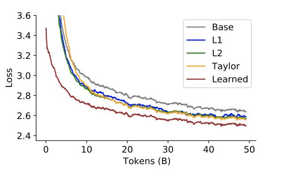 删除大模型中的多个层来验证层的重要性。不同大模型上的实验结果表明,靠近首尾的层中间层更重要。在每个层内部,可以用各种度量函数来评估参数的重要性,包括权重的范数、泰勒展开式、数据驱动可学的度量等。下图比较了使用不同度量选择参数后模型训练效果和收敛速度。使用数据驱动学习的度量是最有效的,可以从较好的起点开始,以更快的速度收敛到更低的 loss 值。