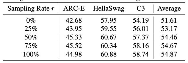 为了降低多轮训练的成本,可以使用第一轮的训练 loss 来做数据筛选和精炼,优先选择 loss 大的数据送入第二轮。用 r 表示第 2 轮训练时样本的采样率,可以发现当采样率超过 50% 时,模型效果的提升比较小。
