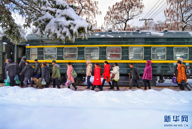 在雪地中,旅客上车也是一道美丽风景。新华网发 曲晓曦摄