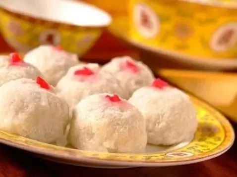 第四步,取一勺江米饭,将它放在面粉上来回搓揉,使江米饭完全沾满面粉,然后将它按扁,薄厚由自己喜好而定,包上拌好的糖馅,将周边捏合到一起,在蒸熟的面粉里滚一圈,墩成圆滚滚一个小雪球,在上面点缀一小块红豆大小的山楂糕,即成。