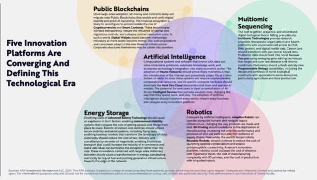 颠覆性技术创新平台根据ARK的研究,颠覆性技术的融合将定义下一个十年的发展,五个主要技术平台——AI、公共区块链、多组学测序(Multiomic Sequencing)、能源存储和机器人——正互相融合,改变全球经济活动,经济增速可能从过去125年平均3%加速至未来7年的7%: