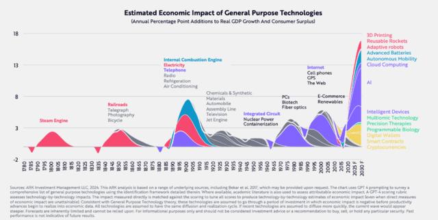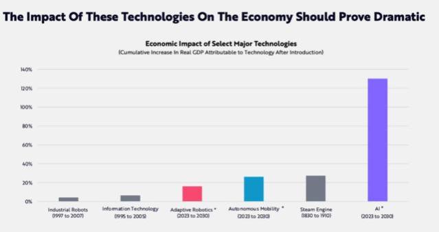 在AI技术突破的推动下,到 2030 年,与颠覆性创新相关的全球股票市场价值可能会从占总市值的16%增加到60%以上。因此,与颠覆性创新相关的年化股票回报率可能会在2030年超过40%。未来七年,其市值将从目前的约19万亿美元增加到2030年的约220 万亿美元。报告称,下图可以看出蒸汽机、铁路与电报等技术、电力与电话、电台等通用技术对经济产生的影响。如今,AI、机器人等颠覆性技术融合对经济的影响将超越此前的通用技术: