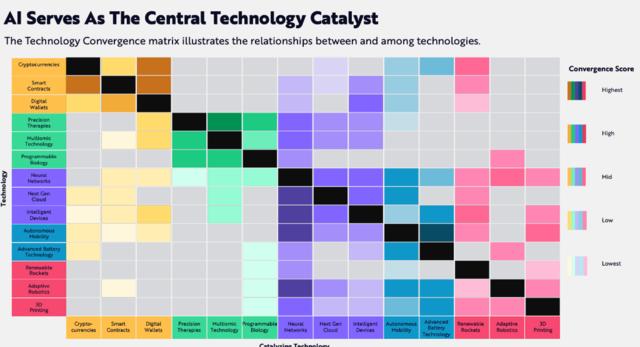 这些颠覆性技术彼此之间也会相互融合与影响的程度也各不相同,有的技术融合度非常高(比如 AI),有的比较低(比如精准疗法)。AI的融合程度可以展现出核心技术催化剂的地位和作用。