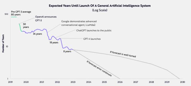 报告指出,AI 的发展速度也快于市场预期。2019年市场普遍预期通用 AI 的出现要等 80 年,2020年又从80年减到50 年、2021年减到34年。GPT-4 出现后,预期时间甚至缩短到了 8 年。Ark预期通用AI有早则出现在2026年,晚则2030年出现: