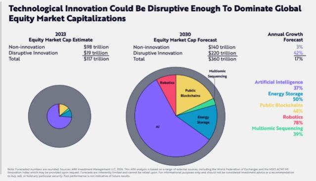 2.与颠覆性创新相关的股票市值将以每年40%的速度增长,从当前占全球股市总额的16%激增至2030年占比超60%,市值从当前的约19万亿美元增长到2030年的约220万亿美元。