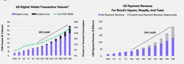 未来七年内,C2B数字钱包支付总额将以每年20%的速度增长,从2023年的约2万亿美元增长到2030年的约7万亿美元。闭环支付的占比将从4%增加到25%,Block's Square、Shopify和Toast的支付收入预测从35亿美元增加到210亿美元,年化增长率为29%。