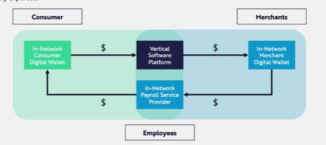 Ark认为,双边市场能够在消费者和商家之间关闭金融循环,闭环支付生态系统通过三种方式内部转账来实现:从消费者到商家、从商家到员工、以及从员工(同时也是消费者)到商家。为了构建这些支付生态系统,平台必须具备:1)大型且参与度高的双边网络,2)对商家运营和财务的端到端可见性,以及3)垂直行业专长。