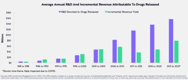 精准治疗&多组测序发展Ark指出,过去的二十年来,精准治疗、CRISPR基因编辑、RNA治疗和靶向蛋白质降解的新模式激增,在人工智能(AI)、CRISPR基因编辑和新测序技术驱动下,创新疗法增加了研发的回报,一些原本被认为无法靶向药物治疗的疾病,现在可以被新开发的药物治疗,为某些疾病提供了新的可能性: