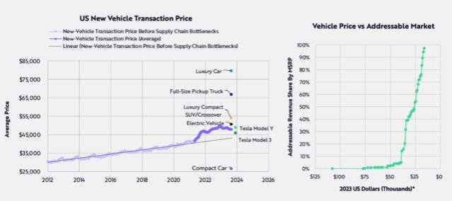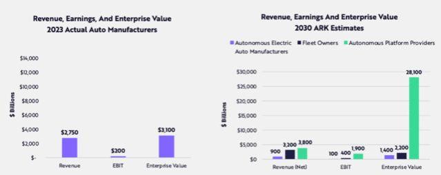 “木头姐”在报告中强调,自动驾驶出租车市占率提升将颠覆美国汽车贷款行业,到2030年,自动驾驶平台提供商的企业价值可达到28万亿美元,相当于2023年所有汽车制造商市值的9倍:在过去三年中,利率上调使新车每月汽车贷款支出增加了约27%,从581美元增至739美元。这也使得汽车贷款拖欠超60天的数量最近创下了历史新高。