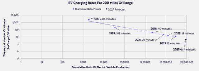 根据莱特定律,千瓦时产量每翻一番,电池成本将下降28%。磷酸铁锂电池正在抢占富镍电池的市场份额,这说明随着电池化学成分的不断变化,预测商品价格是非常困难的。莱特定律也指向更快的电动汽车充电速度,电动汽车的充电速度似乎可以很好地代表整体性能,包括效率、续航里程和功率。