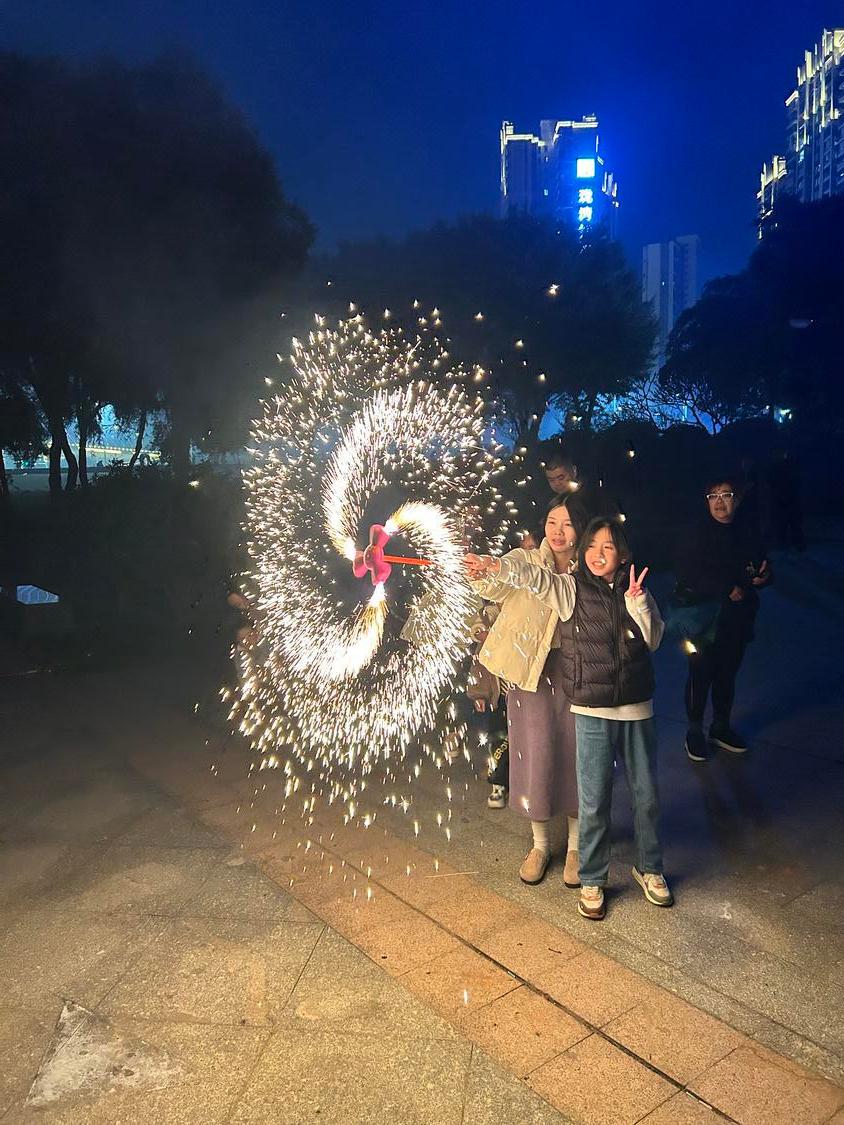 半月岛湿地公园烟火璀璨 。初二晚上9点,在禅城区半月岛湿地公园,烟花绽放的响声此起彼伏,大批市民聚集在公园燃放区域放烟花贺新年。市民杨小姐在晚饭后就跟家人一起到这里放烟花。她说,小时候每逢过年都会跟家人好友一起放烟花庆祝,主要是地老鼠、仙女棒等在地面燃烧的烟花。现在烟花的种类已经是五花八门了,像加特林、财富连年等升空类的烟花的燃放也经常在社交平台上刷到,所以当天也在燃放区域内的零售点买了一个地面礼花,感受一下自己专属的那片璀璨。