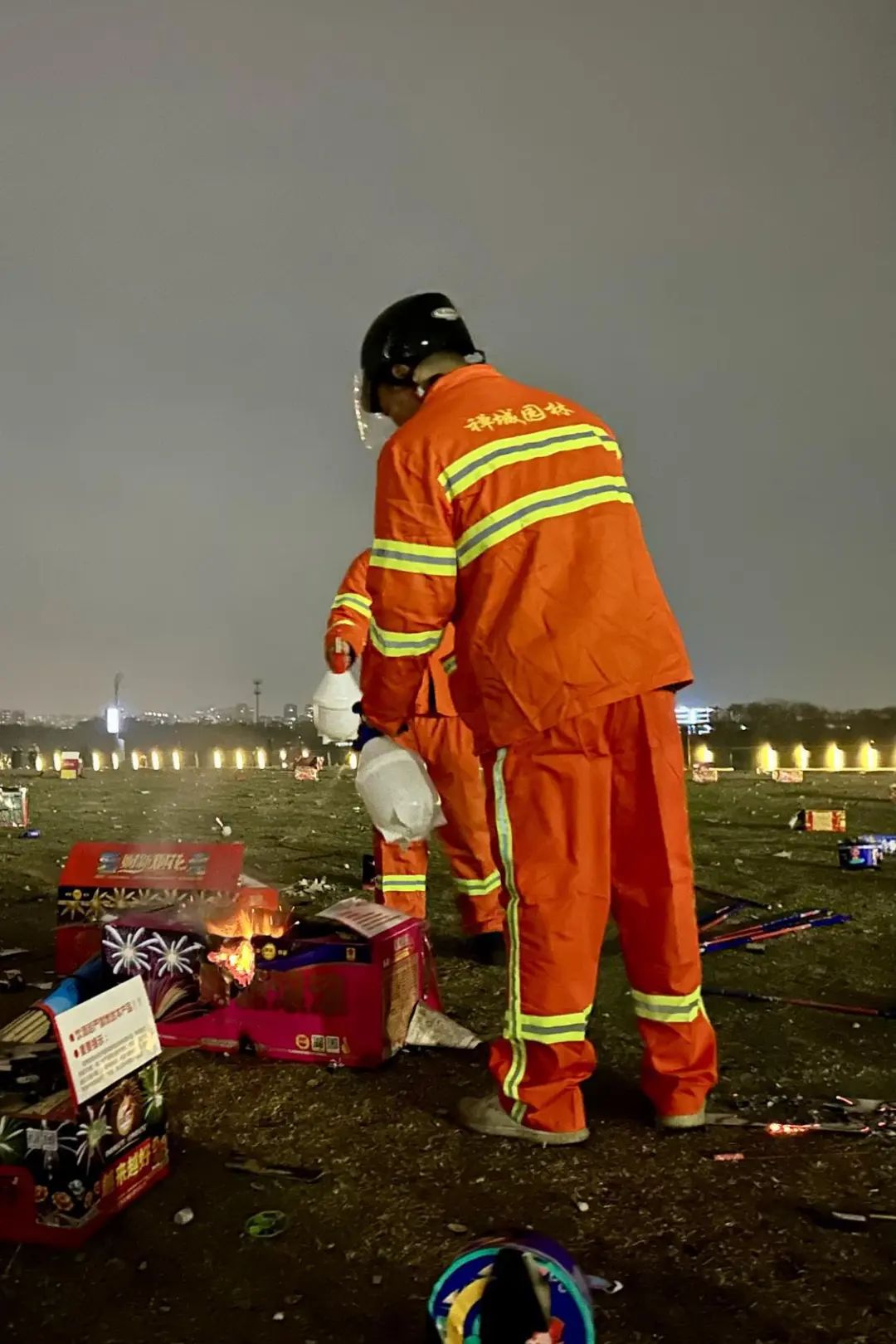 工作人员用喷壶将燃烧中的烟花包装盒浇灭。【烟花爆竹燃放信息知多D】
