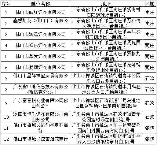 今年春节,禅城区在10个燃放区域内分别匹配了1-2个烟花爆竹零售点,首批共审核通过12个烟花爆竹零售点。