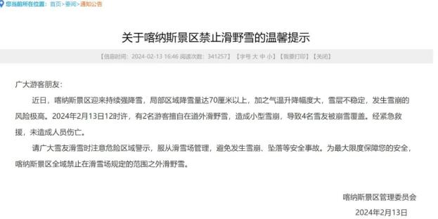 发布关于喀纳斯景区禁止滑野雪的提示,