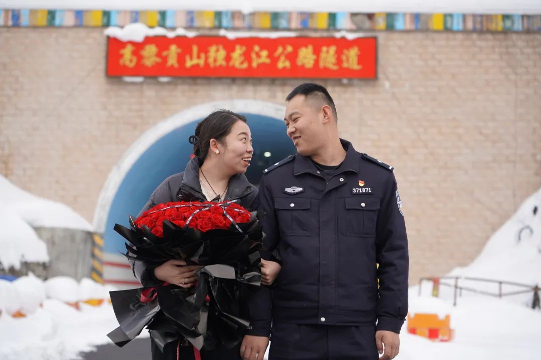 “正所谓爱隔山海、山海皆可平”。2020春节前夕,王晶第一次从老家山东过来陪他过年,王晶作为一个山东长大的孩子,云南山路让她感到不适,特别是县城进入独龙江公路的79公里路程,749道弯,让王晶胃里翻江倒海般的难受,最后还是吐了。就这样一路呕吐,到了高黎贡山独龙江公路隧道口。当时,张礼慧和同事们也正在高黎贡山公路隧道开展保通工作,两人就在隧道口偶遇。看着女朋友奔波千里来看自己,张礼慧满是心疼。他决定在单位向王晶求婚,第二天晚上,张礼慧在派出所营区,在全体民警、辅警的见证下,给了她一个终生难忘的求婚仪式。
