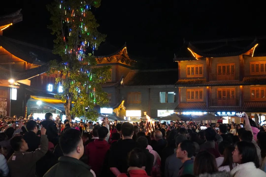 在四方听音广场,游客们围着篝火起舞。欢快的音乐伴着律动的舞步,现场气氛热烈,活动在歌曲《哈尼宝贝》中推向高潮。
