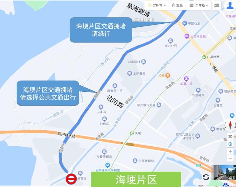 载客前往海埂大坝的出租车和网约车,可沿滇池路—迎海路—观景路北段(50米处)进入专用通道,并在通道内即停即走,快速上下客。
