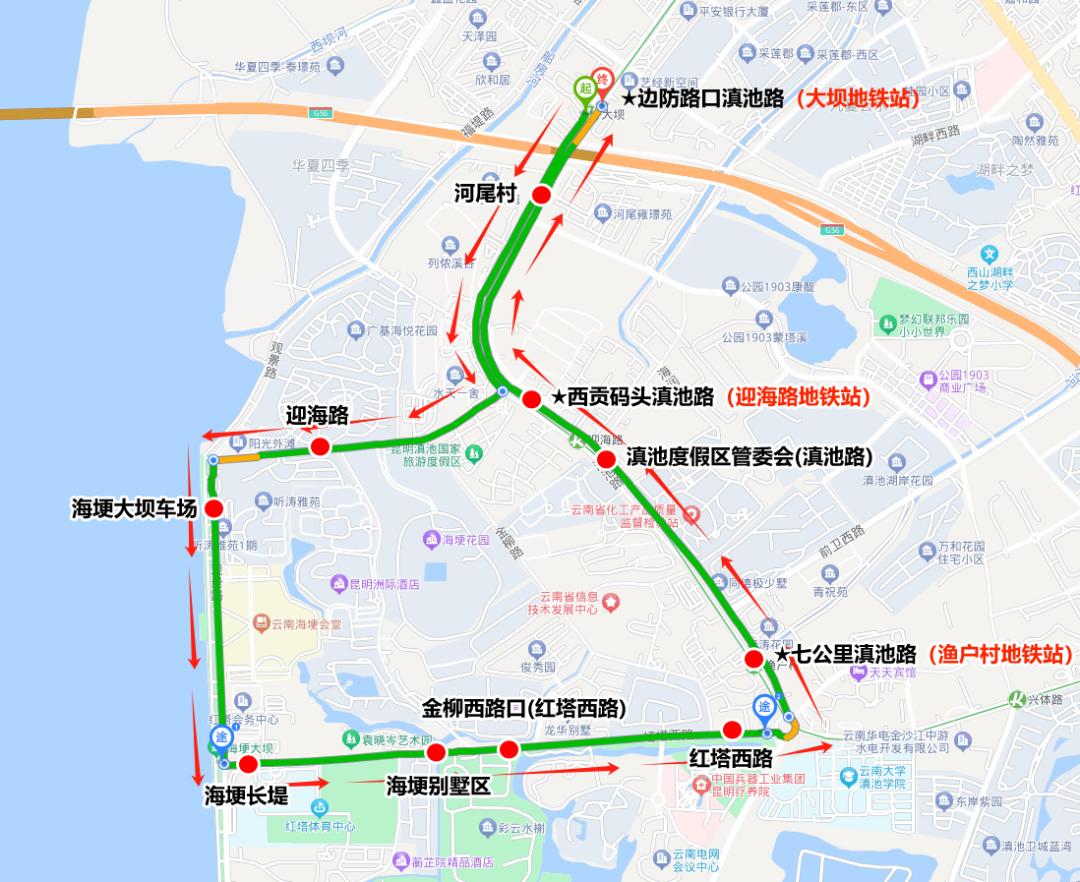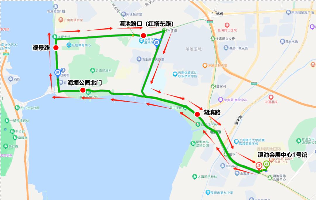 旅游大巴车通行线路统一调整为:驶入:沿滇池路—湖滨路—观景路—红塔西路—右转红塔体育中心