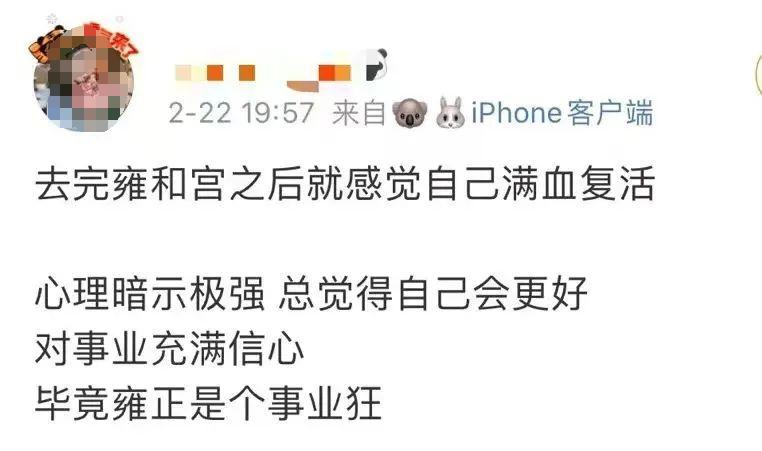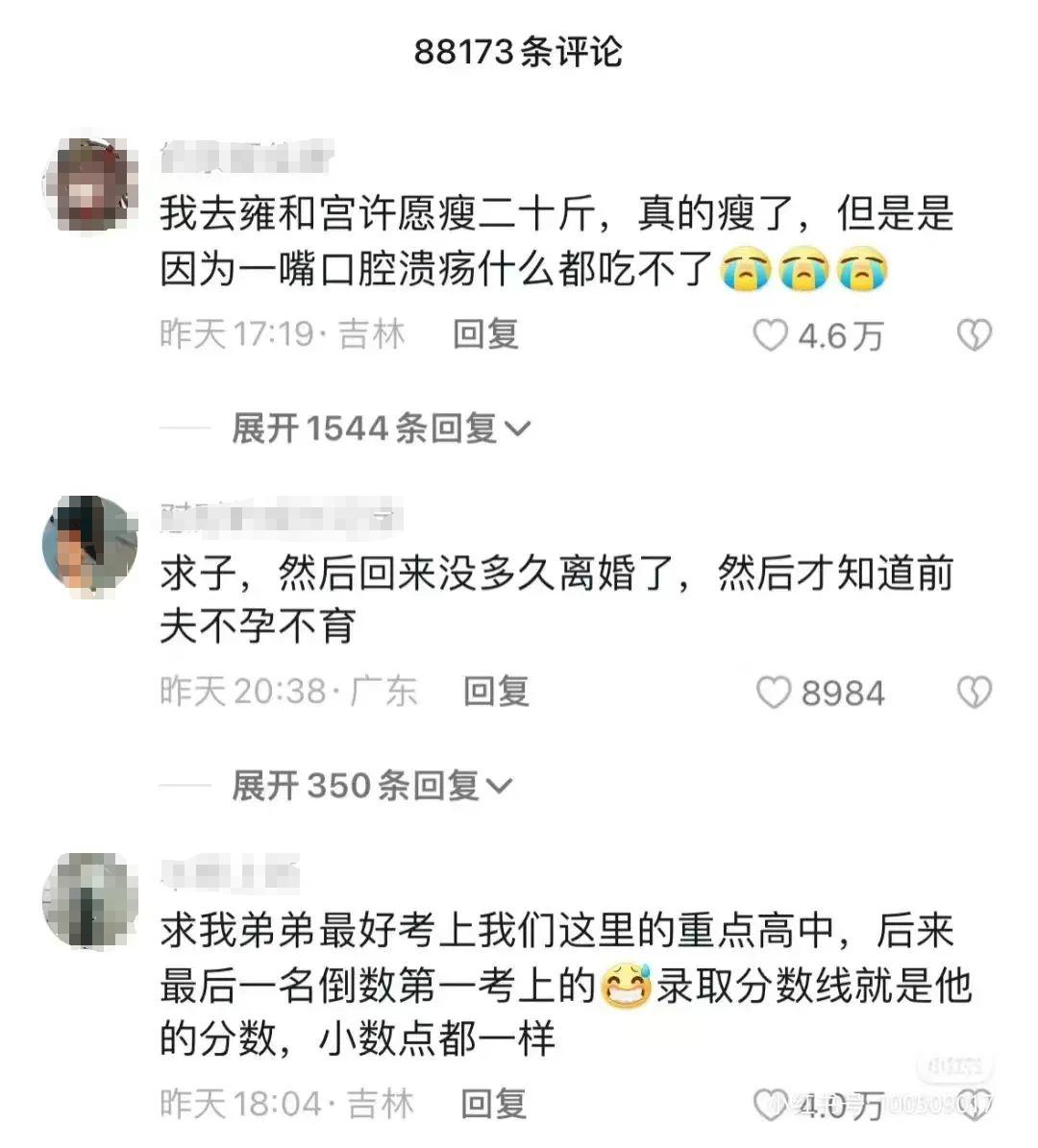 留言区还有很多声音,大意是雍和宫许的愿通通实现了,只是“显灵方式”有点特别。比如有人说,自己许愿要瘦二十斤,结果得了口腔溃疡,咔咔掉秤,真瘦了: