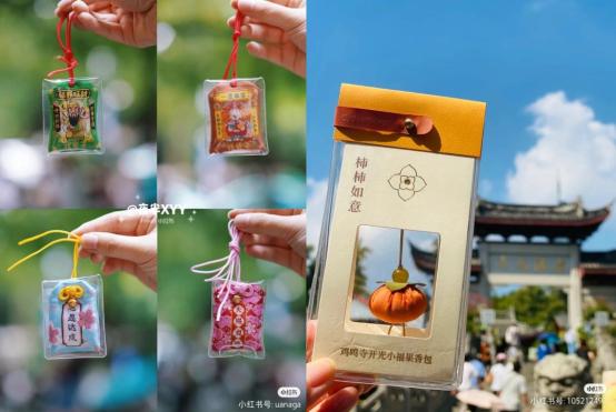 月薪两万,喝不起30-50一杯的奶茶咖啡,但如果是庙里出的网红款,闭着眼睛买。再比如,南京鸡鸣寺的柿柿如意香囊,与杭州的法喜寺护身符,都设计得小巧又可爱,让人想买回来戴在身上。