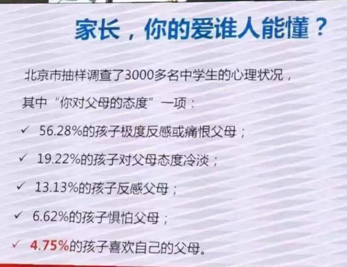 北京市抽样调查了3000多名中学生的心理状况,其中“对待父母的态度”一项中:竟然有超过一半的孩子都选择了“极度反感或痛恨父母”,而喜欢父母的孩子只有不到5%。