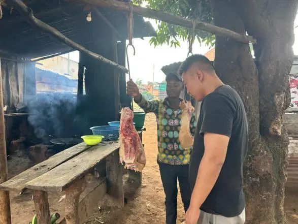 由于彼此都是工业园区的邻居,串门变得格外容易。豆腐、油桃、柿饼、柚子、粑粑柑、腊肉……年夜饭餐桌上的食材也在我们之间的来往中逐渐丰富。除了从中国超市能够购买较为昂贵的食材外,我们也会到镇上看看,和本地人讨价还价,享受“小小的胜利”。一只冷冻的整鸡可以讲到19000先令(约35人民币)。深入镇子的巷子,还能买到当天现杀的猪肉。这里的人们早已习惯了中国面孔,对我们并无“新鲜感”。