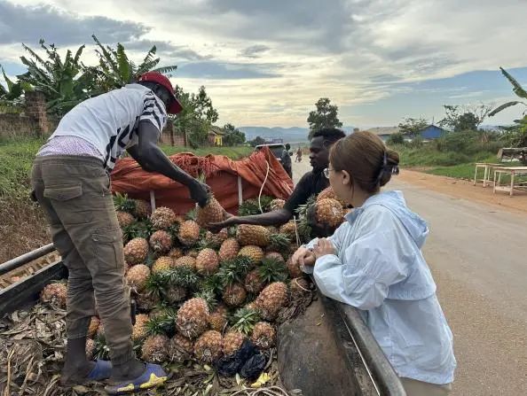 厂里的中国大厨计划从镇子上买些活鸡回厂区饲养,但在打听了价格后,司机阿里建议大厨找乡下的饲养户买,说应该更划算。阿里是公司成立初期雇佣的第一位员工,已是我们的“老人”。回程时,我们还遇到了卖凤梨的,欣然买下10个。