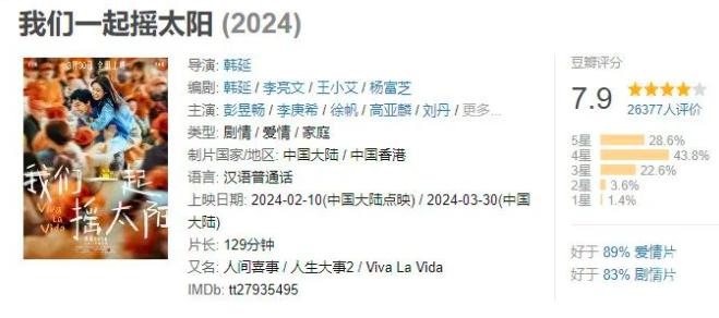 高分电影为何票房惨淡?虽然《我们一起摇太阳》票房不理想,但口碑不俗,豆瓣评分为7.9分,在今年的春节档电影中仅次于《热辣滚烫》的8分,高于同为7.8分的《飞驰人生2》和《第二十条》。