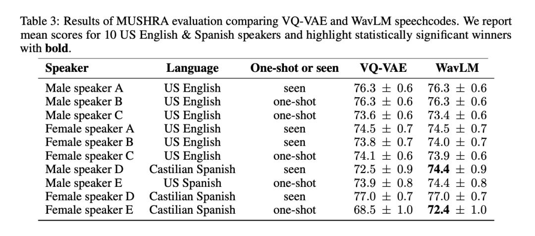 为了全面测试两种语音 token 化方法的质量和通用性,研究者对 6 位美式英语和 4 位西班牙语说话人进行了 MUSHRA 评估。就英语的平均 MUSHRA 分数而言,基于 VQ-VAE 和 WavLM 的系统不相上下(VQ-VAE:74.8 vs WavLM:74.7)。然而,对于西班牙语,基于 WavLM 的模型在统计学上显著优于 VQ-VAE 模型(VQ-VAE:73.3 vs WavLM:74.7)。请注意,英语数据约占数据集的 90%,而西班牙语数据仅占 2%。