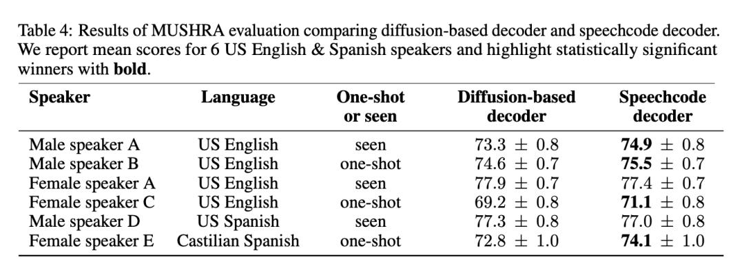 然后,研究者评估了对语音编码进行声学解码的两种方法:基于扩散的解码器和语音编码解码器。