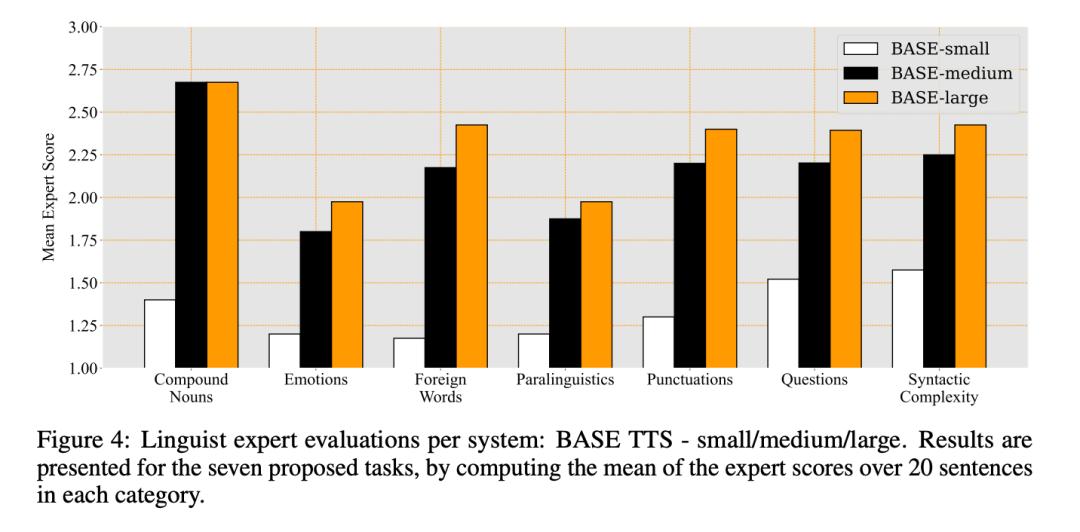 在完成这些结构消融后,研究者评估了 BASE TTS 在数据集大小和模型参数的 3 种变体中的涌现能力,并由语言专家进行了评估。