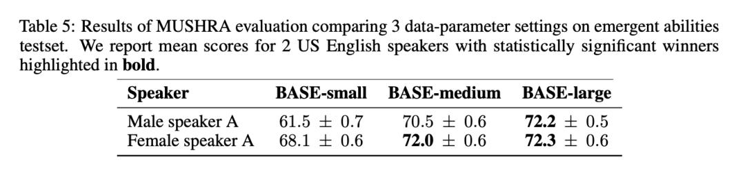 在表 5 的 MUSHRA 结果中,可以注意到语音自然度从 BASE-small 到 BASE-medium 有明显改善,但从 BASE-medium 到 BASE-large 的改善幅度较小: