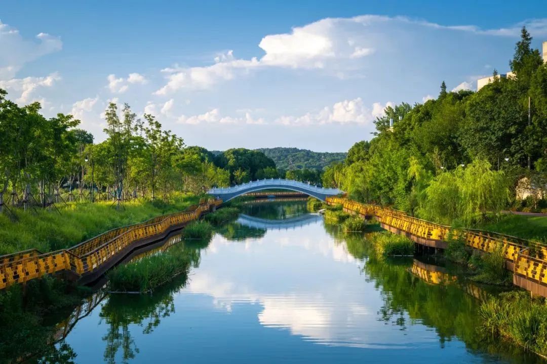 湖溪河往东校区走着,穿越红木板铺就的喻岱桥,微波荡漾的湖溪河就会映入眼帘。蜿蜒但不曲折的小路通往的湖溪门,出门便是梦境般的喻家湖。这里道路两侧的绿树郁郁葱葱,巨大的湖面恰如天空的镜子,映出蓝天白云的模样。