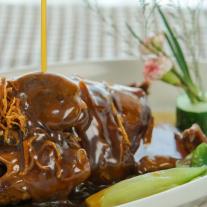 “色泽光亮”,看外表已诱人食欲;“皮香甜脆”,吃入口更感其味;“肉滑骨酥”,慢慢咀嚼渐入佳境;“肥而不腻”,口感丰富饱满,味道浓郁且不油腻。