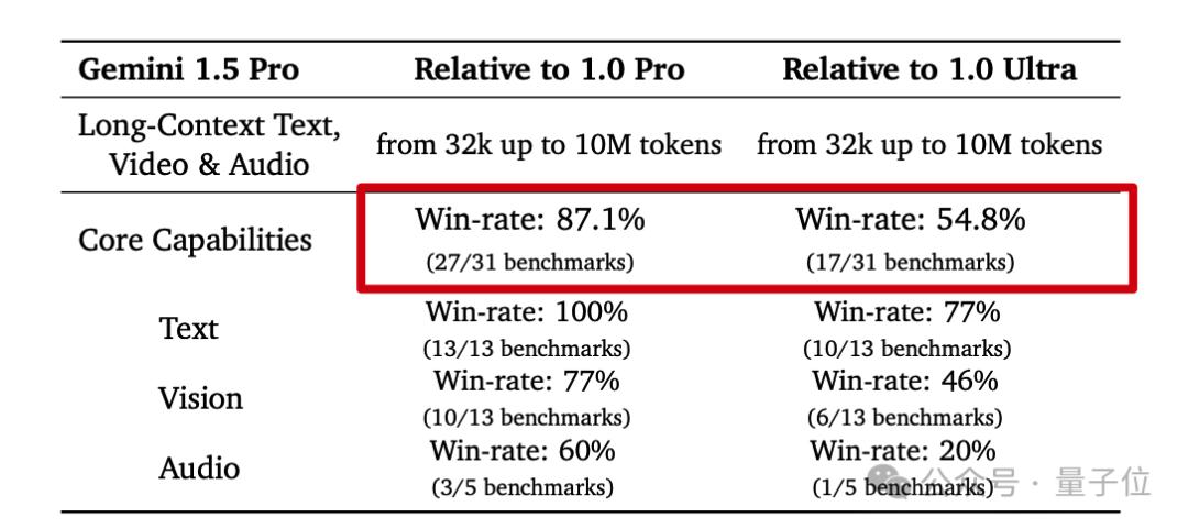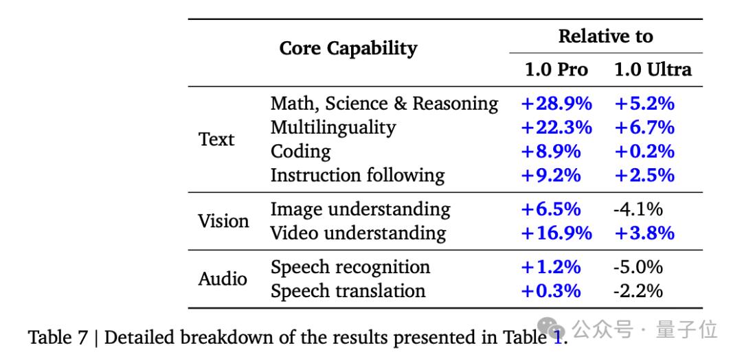 与上代1.0 Pro相比,1.5 Pro在数学、科学、推理、多语言、视频理解上进步最大,并达到1.0 Ultra层次。