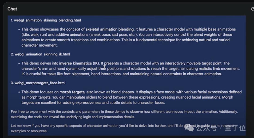 演示中他们将所有内容放到了一个txt文件中,共816767 token,输入给模型并要求它“找到三个示例来学习角色动画”。结果模型查看了数百个示例后筛选出了三个关于混合骨骼动画、姿势、面部动画的示例。