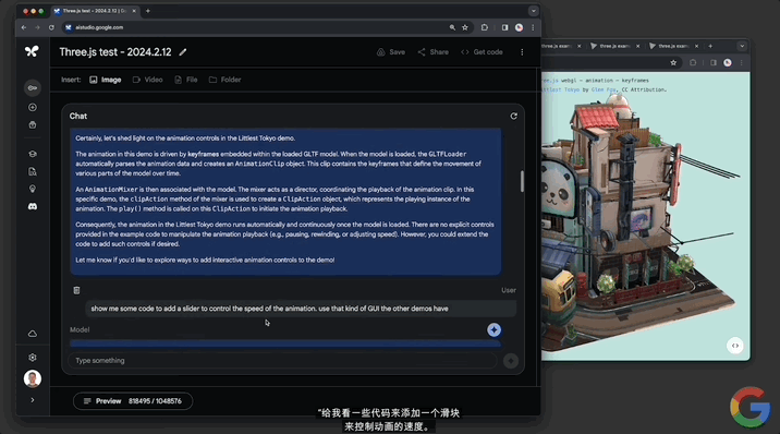 这只是开胃小菜。接下来只用文字询问模型“动画Little Tokyo的demo是由什么控制?”模型不仅找到了这个demo,并且解释了动画嵌入在gLTF模型中。