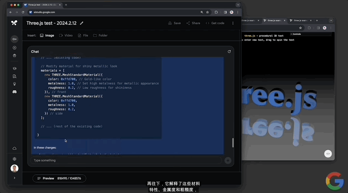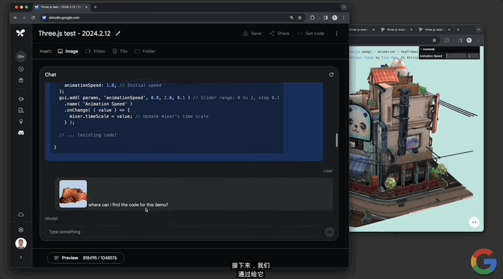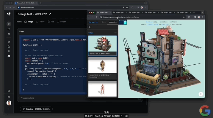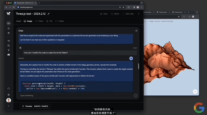 在第二段演示视频中,谷歌展示了Gemini 1.5分析和理解复杂代码库的能力。用到的是Three.js,这是一个3D Javascript库,包含约100000行代码、示例、文档等。