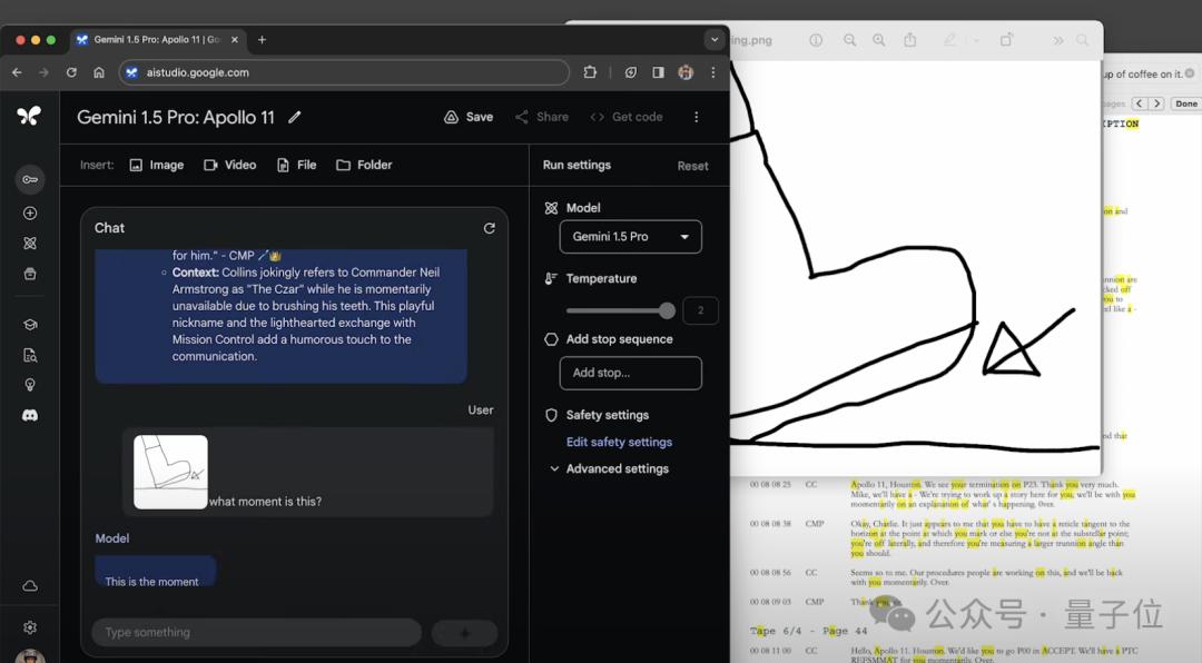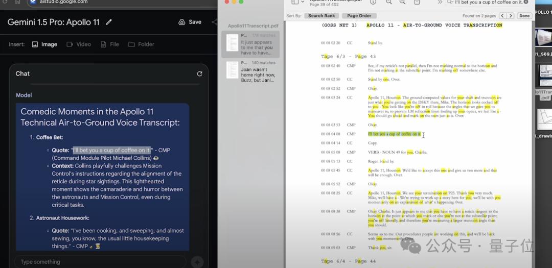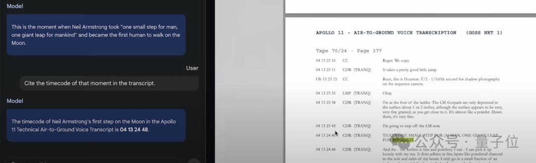 第三个演示视频展示的是Gemini 1.5的文档处理能力。选用的是阿波罗11号登月任务的402页PDF记录,共326658 token。