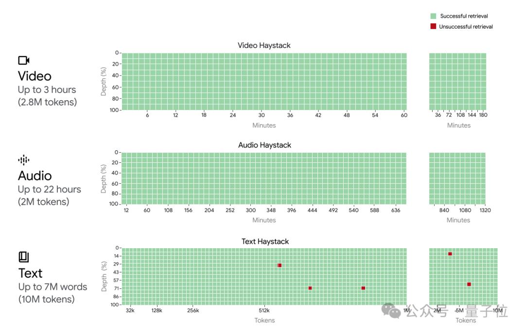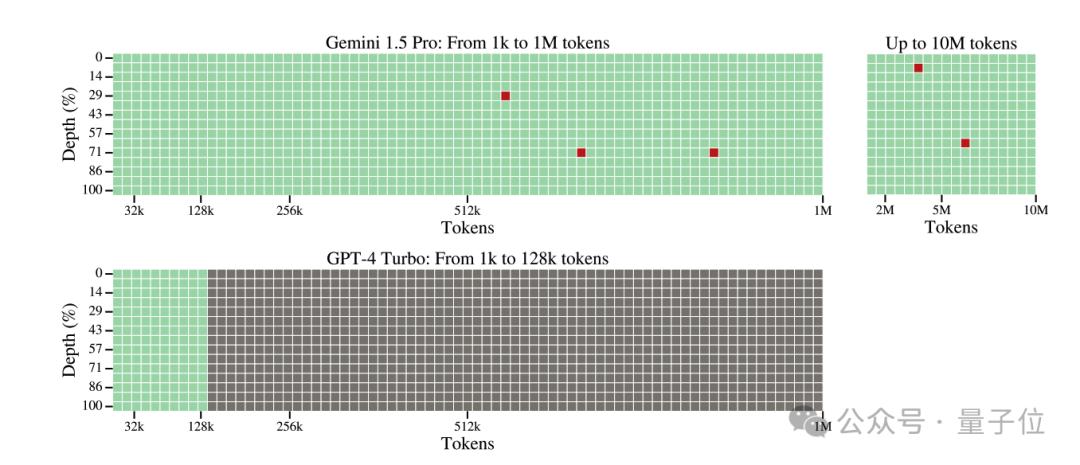 为验证长上下文窗口的性能,使用了开源社区通行的大海捞针测试,也就是在长文本中准确找到可以藏起来的一处关键事实。结果50万token之前的表现非常完美,一直到千万token,Gemini 1.5也只失误了5次。