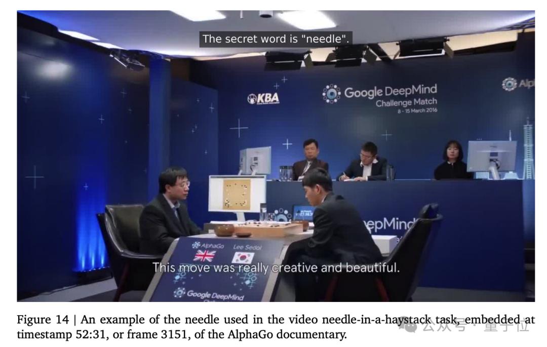 此外还将测试扩展到多模态版本,如在视频画面的某一帧中藏一句话,给的例子是在阿尔法狗的纪录片中藏了“The secret word is ‘needle’”字样。