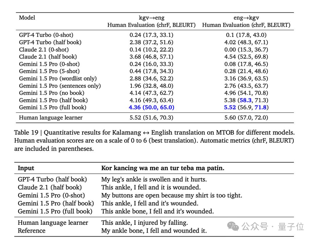 输入一整本语法书,Gemini 1.5 Pro就能在翻译全球不到200人使用的Kalamang上达到人类水平。相比之下,GPT-4 Turbo和Claude 2.1一次只能看完半本书,想获得这个技能就必须要微调或者使用外部工具了。