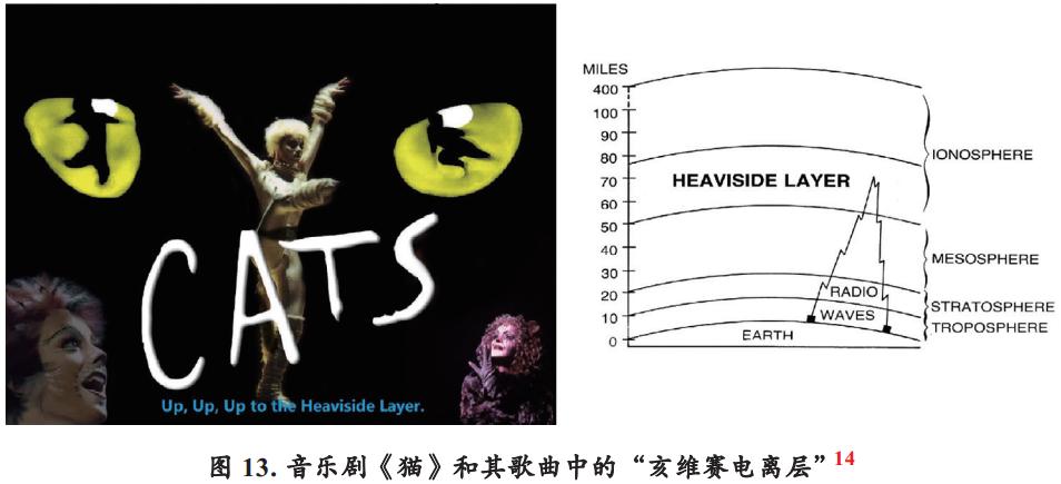 是啊!这简直也是对他自己的写照。这么一位自学成才的“民科”,居然在电讯工业、 电磁科学、运算微积分和广义函数诸方面对人类做出了如此广泛且影响深远的贡献。他就像1981年开始的音乐剧“猫”(Cats)中所唱的那样,“Up, Up, Up to Heaviside Layer”。连音乐剧都在欢呼亥维赛的功绩和高尚(图13)。尽管在英美等国,不乏科学界知名人士对亥维赛的理解或支持,但是学术界对他的工作和观念仍然存在着传统的轻蔑。这次英国皇家学会的纪念活动似乎有彻底平反的意味。这是对一位高尚的智者长期轻蔑冷淡后的醒悟。