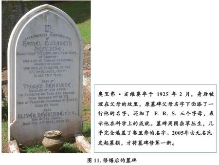 亥维赛确实有时会受到并非轻度的偏执狂的困扰,并抱怨自己受到监视。他在牛顿阿伯特也患有严重的身体疾病,主要是“热病和寒症”的反复发作,到 1905年几乎使他的科学工作完全停滞不前。顺便插一句,他坚定地反对爱因斯坦的相对论,这在数学家中几乎绝无仅有。三年后,在一个特别严寒的冬天过后,他的哥哥查尔斯安排亥维赛搬到托基(Torquay),1908年起他与查尔斯妻子的未婚妹妹玛丽·韦(Mary Way) 共同居住在一幢大房子里,并帮助支付她的抵押贷款(事实上,亥维赛在1911年接管了这所房子——Homefield)。他的健康状况有所改善,但他对韦无情的发号施令已经达到专横无比的程度,迫使她在1916年搬走,让亥维赛在与日俱增的孤独和古怪中度过晚年。邻居发现,他那空荡荡的房间里耸立着花岗岩石块,就像新石器时代的巨人的家具似的。他在那奇妙的房间里徘徊,变得愈来愈脏,越来越凌乱。但有一例外,他的指甲总是修剪得很精致,还涂上樱桃粉红颜色,闪闪发光。1925 年初,亥维赛的健康完全崩溃,塞尔帮助他搬到一家养老院,他于2月3日从梯子上坠落去世,被送到佩恩顿公墓与父母同葬。在原来的墓碑上,父母的名字下面添上了“Oliver Heavside”。因年久失修,杂草丛生,他的名字常被遮盖掉。直到2005年,一个匿名捐助者清理了墓碑周边杂草,使之重见光明。