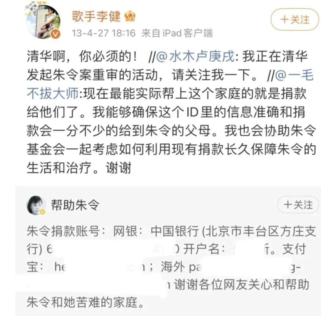 朱令在世时,李健就在社交平台呼吁过大家给朱令家人捐款,这些年,作为清华校友的李健,为她多次发声。
